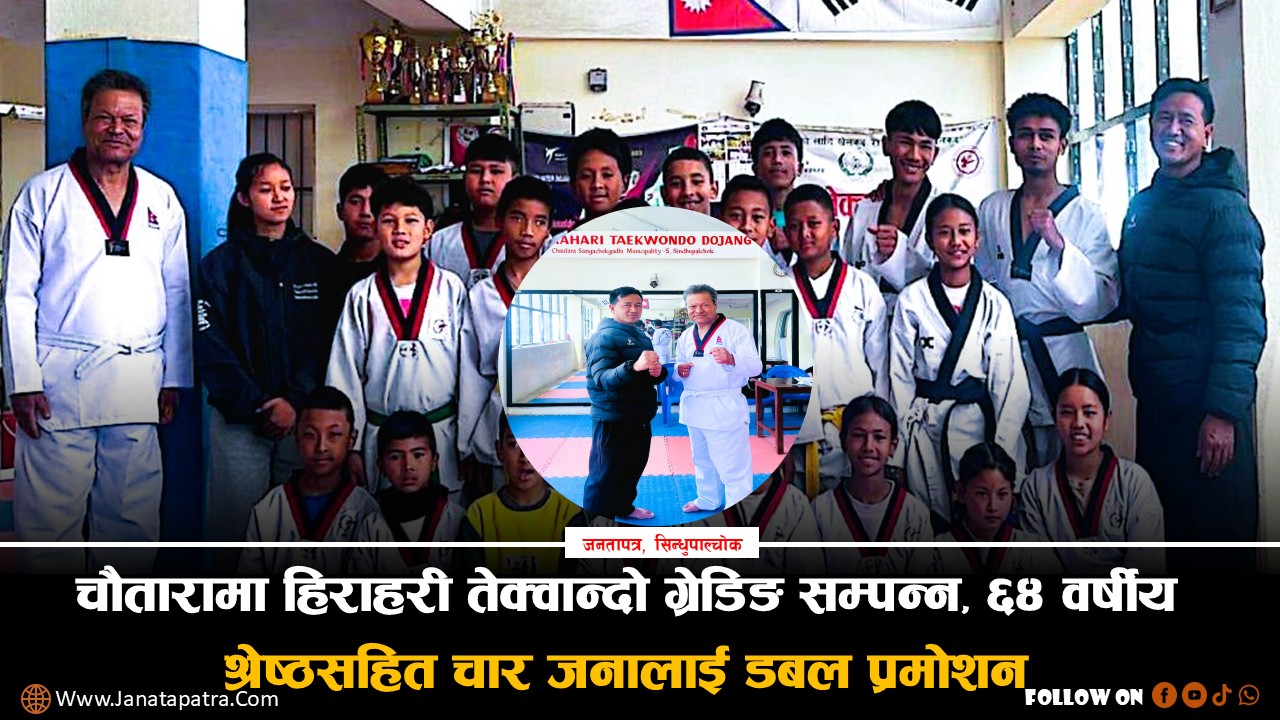 जनतापत्र,सिन्धुपाल्चोक ।सिन्धुपाल्चोक जिल्लाको चौतारास्थित हिराहरी तेक्वान्दो डोजाङ्गमा नेपाल तेक्वान्दो संघ को नियमित कार्यक्रमअन्तर्गत जुनियर बेल्ट प्रमोशन टेस्ट हुँदा चौतारा साँगाचोकगढी नगरपालिका–५ का ६४ वर्षीय धुर्बलाल...