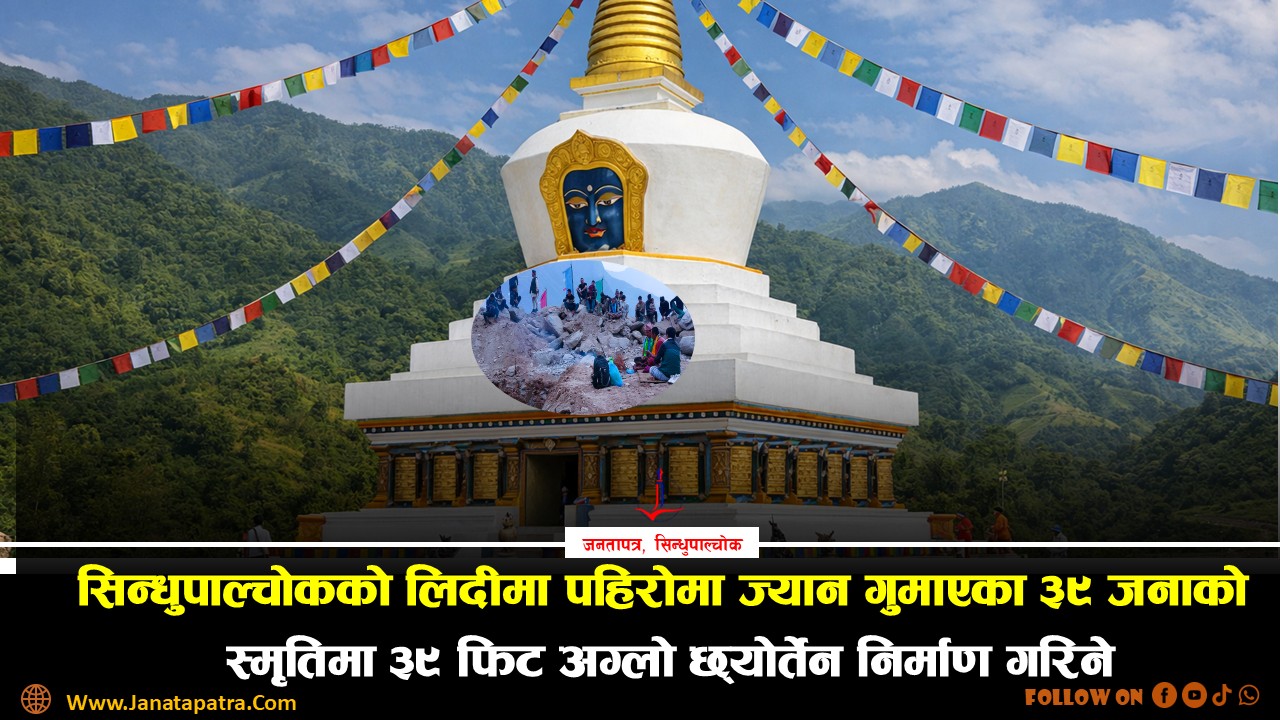 जनतापत्र,सिन्धुपाल्चोक ।सिन्धुपाल्चोक जिल्लाको जुगल गाउँपालिका–२, लिदी पहिरोमा ज्यान गुमएका ३९ जनाको स्मृतिमा ३९ फिट अग्लो छ्योर्तेन (स्तुपा) निर्माण गरिने भएको छ । २०७७ साल साउन...