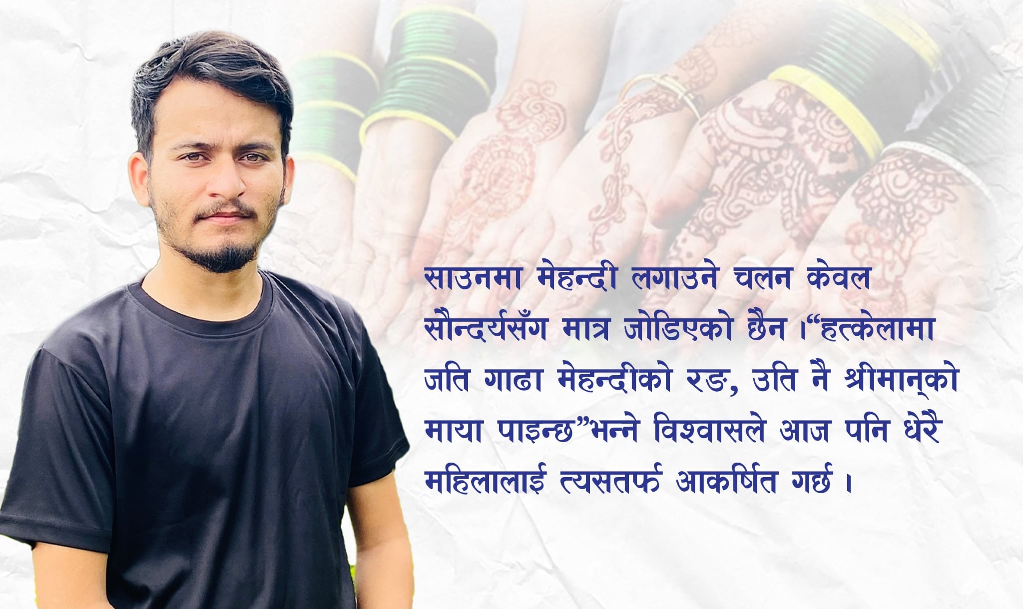 साउन महिना सुरु भएसँगै नेपाली समाज विशेषगरी हिन्दु नारीहरूमा एउटा छुट्टै उत्साह र भक्तिभाव झल्किन्छ। हरियालीको यो महिना जहाँ प्रकृति आफूलाई सिंगार्दै लचिलोपनका साथ ढल्किन्छ, त्यही ढंगले महिलाहरूको नाडीमा हरियो चुरा झन् चम्किलो देखिन्छ, कपडाको रंगमा न्यानोपन आउँछ र हत्केलामा मेहन्दीको गन्ध बासिन्छ। अहिले स–साना बालिका, युवती, अधबैंसे नारी हुन् या बृद्ध महिला, यतिबेला सबैको नाडीमा काँचका हरिया चुरा सजिएको देख्न पाइन्छ। साउन लागे लगत्तै हिन्दु महिलामा छुट्टै उत्साह र उमंग छाउँछ । रातो, पहेंलो र हरियो चुरापोते तथा कपडामा सजिएका महिलाको मन्दिर र बाटोघाटोमा चहल–पहल देखिन्छ। यो दृश्यले हाम्रो संस्कृतिको गहिराइ मात्र होइन, नारीहरूको धार्मिक आस्था र सांस्कृतिक सौन्दर्यलाई पनि उजागर गर्छ। साउनमा मेहन्दी, चुरा, साडी र व्रतको चलन केवल परम्परा पालना मात्रै होइन, जीवनशैलीमै रमाएको एउटा सांस्कृतिक अभ्यास हो। हरियो रङलाई प्रेम र वातावरणसँग, रातोलाई सौभाग्यसँग, र पहेंलोलाई पवित्रता र उज्यालो सोचसँग जोडिन्छ।“हत्केलामा जति गाढो मेहन्दीको रङ, उति नै श्रीमानको माया पाइन्छ” भन्ने विश्वासले आज पनि धेरै महिलालाई मेहन्दीतर्फ आकर्षित गर्छ। साउनको पहिलो सोमबारदेखि नै व्रत बस्ने, शिवालयमा जल अर्पण गर्ने र शृंगारमा रमाउने नारीहरूको यो समर्पणले समाजमा धार्मिक चेतना र सांस्कृतिक सजीवता थप बलियो बनाउँछ। पौराणिक विश्वास अनुसार, साउन महिनामा पार्वतीले कठोर व्रत गरी भगवान शिवलाई पति रूपमा प्राप्त गरेकी थिइन्। त्यसैले आज पनि विवाहित तथा अविवाहित महिलाहरू यस महिनामा शिवको आराधना गरी आफ्नो जीवनमा प्रेम, सौभाग्य र दीर्घायुको कामना गर्छन्।साउन केवल मौसमको परिवर्तन होइन, यो हाम्रो परम्परा, आस्था, प्रकृति र प्रेमसँग जोडिएको महिना हो। महिलाहरूको सिंगार, मेहन्दी, चुरा र व्रतको यो उत्सव केवल बाह्य आवरण होइन यसले समाजमा संस्कार, श्रद्धा र नारीशक्तिको गहिरो सन्देश बोकेको छ।यस साउनमा हामी सबैले प्रकृतिको सौन्दर्यसँगै आ–आफ्नो परम्पराको सम्मान गर्दै, समाजमा सकारात्मक ऊर्जा फैलाउने प्रण गरौं।
