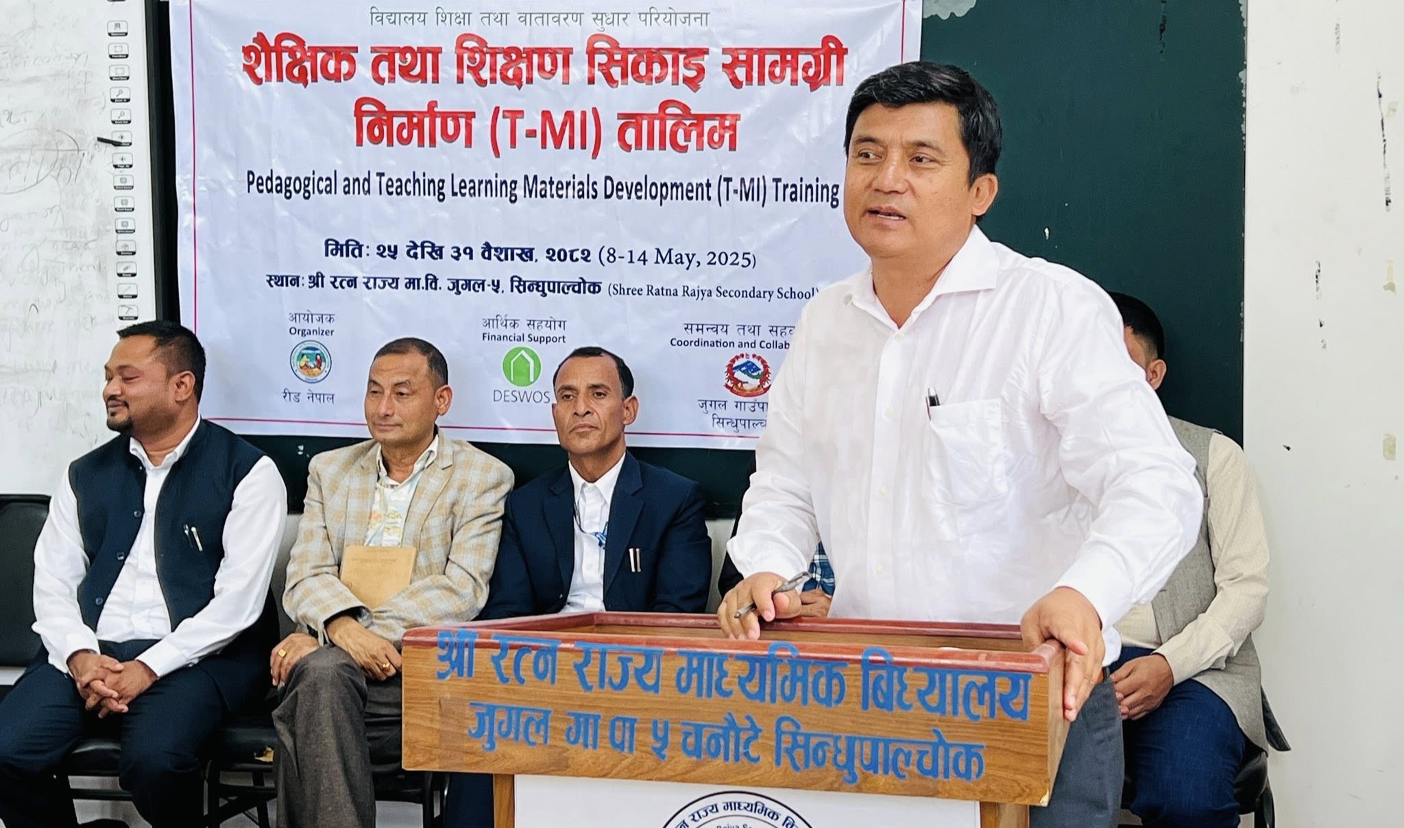 जनतापत्र। सिन्धुपाल्चोक । जुगल, २५ वैशाख २०८२ रीड नेपालको आयोजना, DESWOS को आर्थिक सहयोग र जुगल गाउँपालिकाको समन्वयमा शैक्षिक तथा शिक्षण सिकाइ सामग्री निर्माण (T-MI) सम्बन्धी सात दिने तालिम कार्यक्रम जुगल गाउँपालिकामा सुरु गरिएको छ। तालिम वैशाख २५ गतेदेखि ३१ गतेसम्म सञ्चालन हुनेछ। तालिममा जुगल गाउँपालिका वडा नं. ३, ५ र ७ का आधारभूत तहमा कार्यरत ६० जना शिक्षकहरूको सहभागिता रहेको छ।