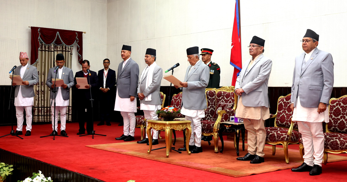 काठमाडौं । प्रधानमन्त्री पुष्पकमल दाहालले मन्त्रिपरिषद् पुनर्गठन गरेका छन् । पुनर्गठित मन्त्रिपरिषद्का तीन मन्त्रीले पद तथा गोपनीयताको सपथ लिए छन् ।