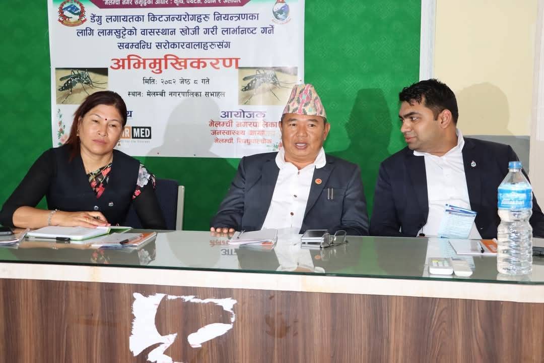मेलम्ची नगरपालिकाले डेङ्गु तथा अन्य किटजन्य रोग नियन्त्रणका लागि विशेष अभियानको थालनी गरेको छ। नगरपालिकाको सभा हलमा आयोजित सरोकारवाला अभिमुखिकरण कार्यक्रममा नगर प्रमुख आइतमान तामाङ र उपप्रमुख उमा प्रधानले समुदायस्तरमै लार्भा खोजी गरी नष्ट गर्न सबैको सक्रिय सहभागिता आवश्यक रहेको बताए।