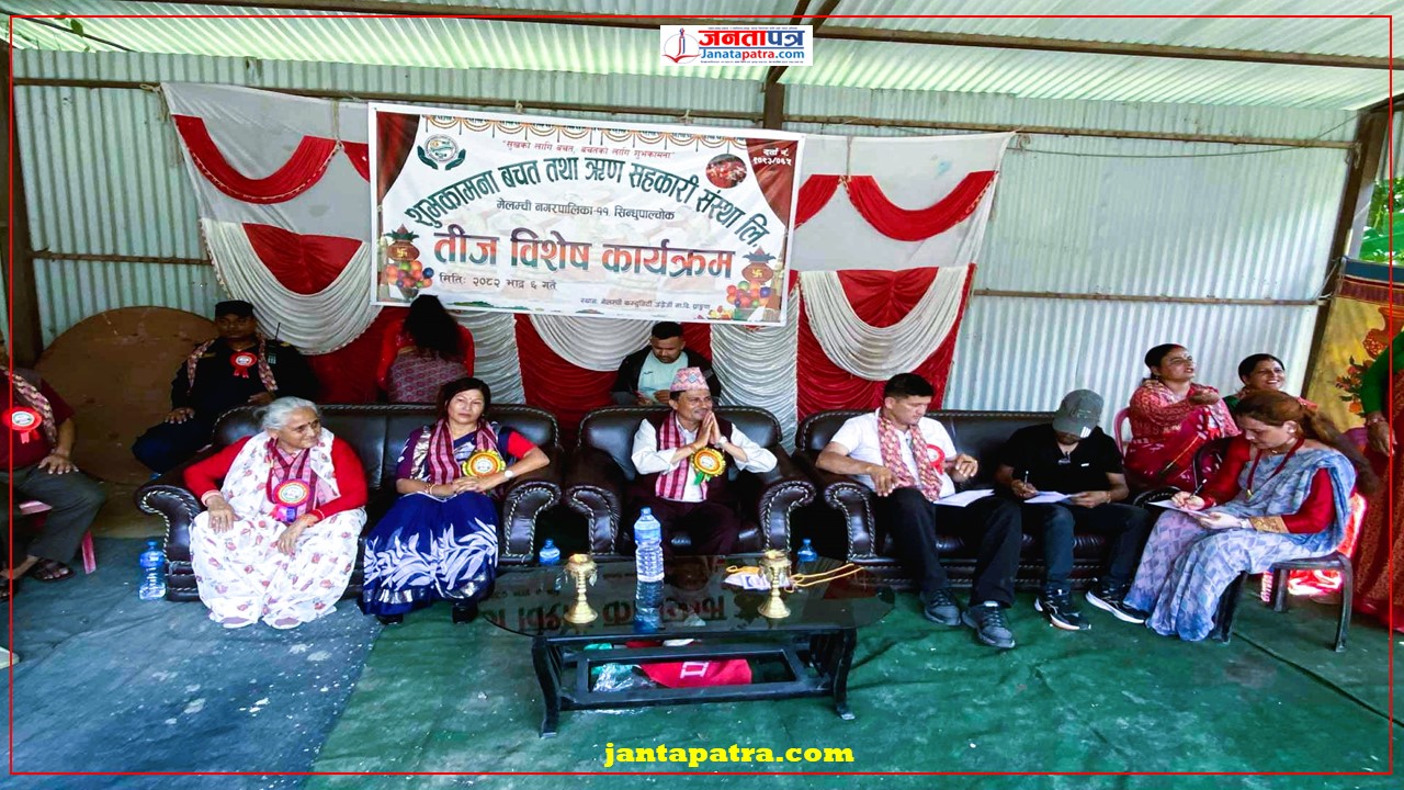 महिलाहरूको महान् चाड हरितालिका तीजको उपलक्ष्यमा शुभकामना बचत तथा ऋण सहकारी संस्था लिमिटेडले मेलम्चीमा एक विशेष कार्यक्रम सम्पन्न गरेको छ। मेलम्ची कम्युनिटी अङ्ग्रेजी माध्यमिक विद्यालयमा सम्पन्न भएको यस कार्यक्रममा सहकारीका सदस्यहरूले मनोरञ्जन र सन्देश दुवै दिने प्रस्तुतिहरू दिएका थिए। उनीहरूले नृत्य र गीतका माध्यमबाट महिलामाथि हुने हिंसा, चेलीका पीडा र सहकारीको महत्त्वजस्ता विषयलाई उजागर गरेका थिए। कार्यक्रमका मुख्य अतिथि मेलम्ची नगरपालिकाकी उपप्रमुख उमा प्रधानले तीज पर्वको शुभकामना दिँदै चाडपर्वहरूलाई विकृतिबाट बचाउनुपर्नेमा जोड दिनुभयो। उहाँले संस्कृति संरक्षण गर्नुपर्ने आवश्यकता औंल्याउनुभयो। यस्तै, सहकारीका अध्यक्ष रुद्रप्रसाद दुलालले संस्थाले सांस्कृतिक कार्यक्रमहरू मात्र नभई सदस्यहरूको हितका लागि विभिन्न चेतनामूलक गतिविधिहरू पनि सञ्चालन गर्दै आएको जानकारी दिनुभयो। उपप्रमुखसँगै निवर्तमान उपप्रमुख भगवती नेपाल र उद्योग वाणिज्य संघ सिन्धुपाल्चोकका पूर्व उपाध्यक्ष रामकृष्ण चालिसे लगायतको उपस्थिति रहेको यस कार्यक्रममा सहभागीहरूले सहकारीलाई निरन्तर अनुगमन गर्नुपर्ने सुझाव दिए। कार्यक्रमको सञ्चालन संस्थाकी संस्थापक प्रतिमा धितालले गर्नुभएको थियो।