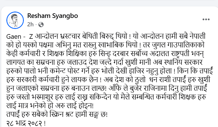 जुगल गाउँपालिकाका अध्यक्ष रेशम स्याङ्वोले जेनजी आन्दोलनका क्रममा संवैधानिक निकायका संरचनामा आगजनी हुँदा त्यसप्रति खुसी व्यक्त गर्ने कर्मचारी तथा शिक्षकलाई तत्काल राजीनामा दिन निर्देशन दिएका छन्।