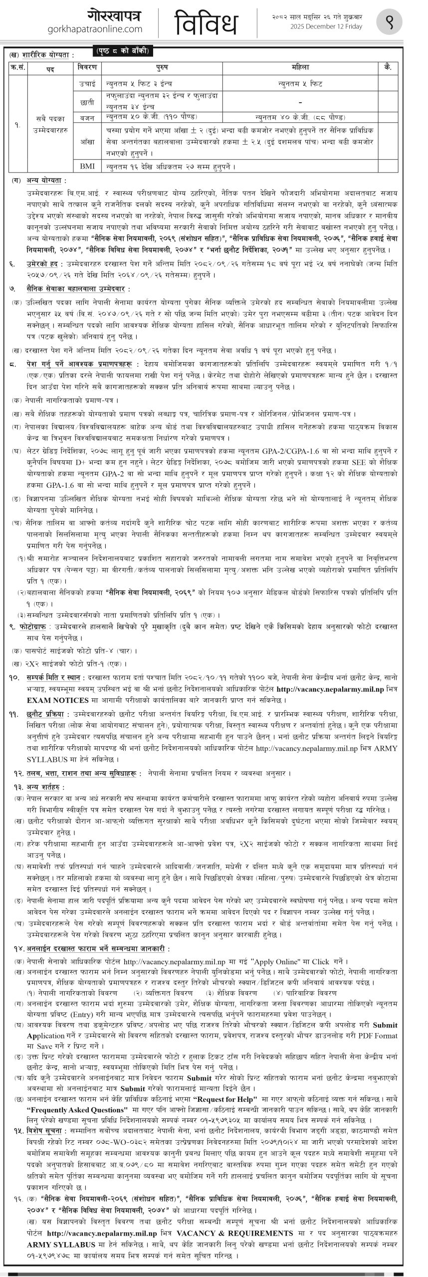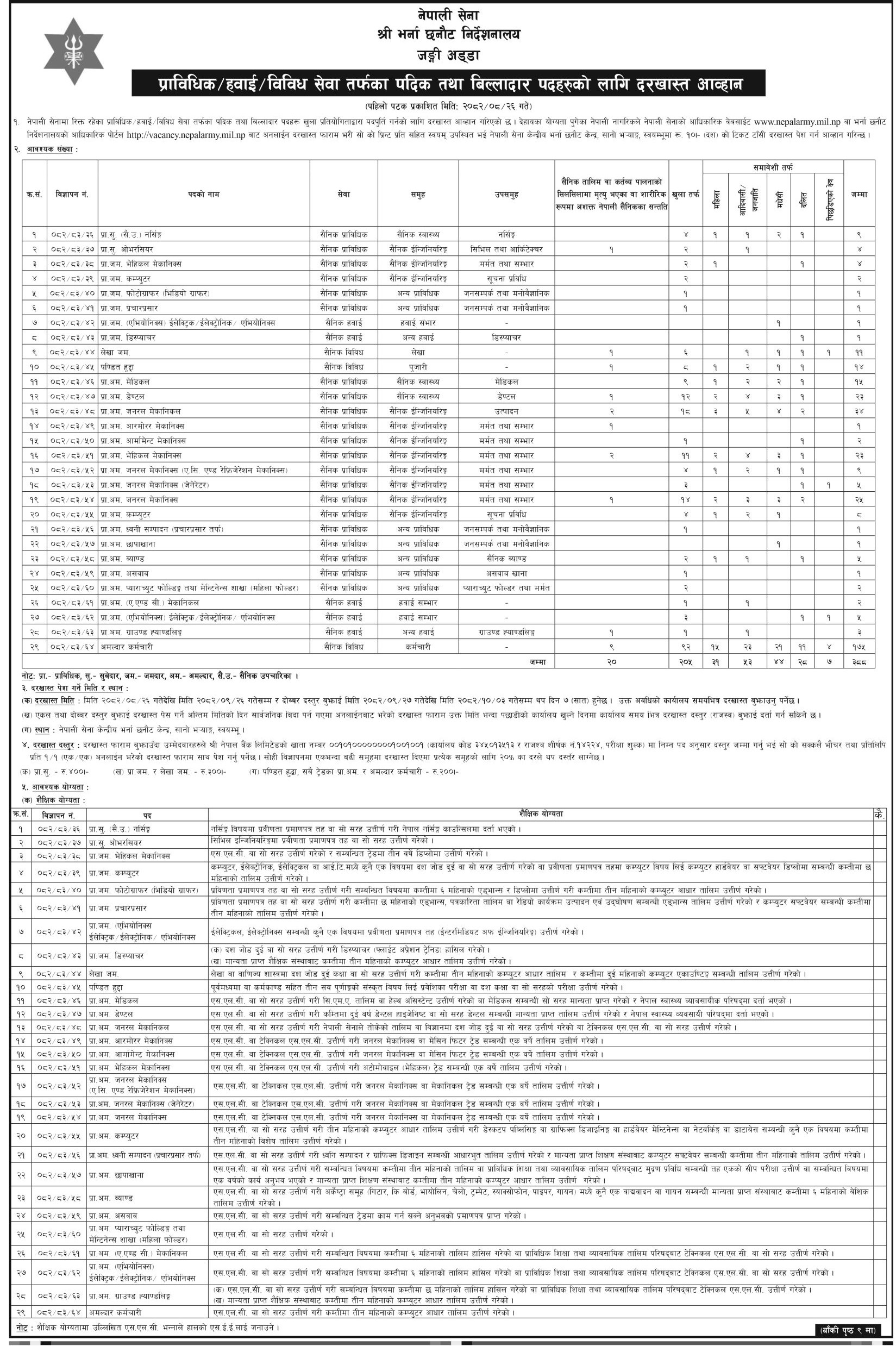 भर्ना अन्तर्गत रहेका प्रमुख पदहरूमा नर्सिङ ओभरसियर, भेहिकल मेकानिक्स, भिडियो ग्राफर, प्रचार-प्रसार, इलेक्ट्रिसियन, डिस्प्याचर, कम्प्युटर अपरेटर, डेण्टल असिस्टेन्ट, ध्वनी सम्पादन तथा ब्याण्डसम्बन्धी पदहरू रहेका छन् । तीमध्ये खुला कोटामा २०५, आदिवासी तथा जनजाति कोटामा ५३, मधेशी कोटामा ४४, दलित कोटामा २८, महिला कोटामा ३१, सैनिक सन्तति कोटामा २० र पिछडिएको क्षेत्रका लागि ७ जना माग गरिएको उल्लेख गरिएको छ । योग्य उम्मेदवारहरूले तोकिएको म्यादभित्र दरखास्त पेश गरी आवेदन प्रक्रिया पुरा गर्न सक्नेछन् ।