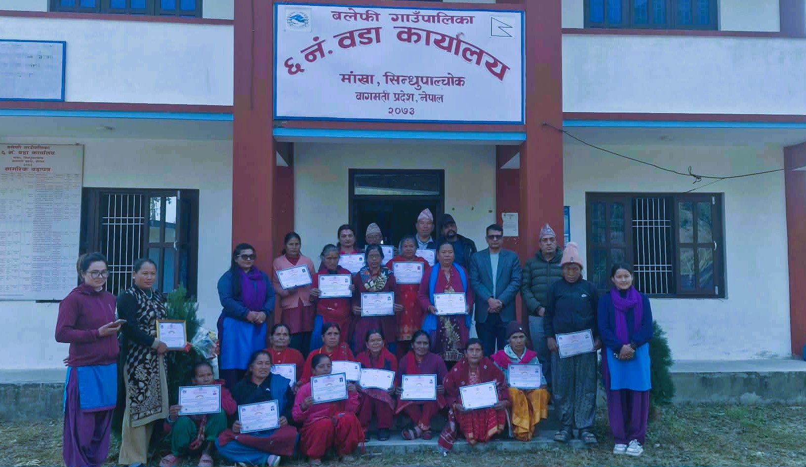 बलेफी गाउँपालिका–६ मा मकैको खोस्टाजस्ता खेर जाने स्थानीय कच्चा पदार्थको उपयोग गर्दै घरायसी सामग्री उत्पादन सम्बन्धी १० दिने तालिम सम्पन्न भएको छ। उद्योग तथा वाणिज्य कार्यालय, सिन्धुपाल्चोकको आयोजनामा भएको तालिमपछि सहभागीहरूले सिकेको सीपलाई व्यावसायिक रूपमा अघि बढाउने प्रतिबद्धता जनाएका छन्।सहभागी नारायण तिमल्सिनाले मकैको खोस्टाबाट बुकी, ढकी, चकटीलगायत सामग्री बनाउन सकिन्छ भन्ने पहिल्यै जानकारी नभएको उल्लेख गर्दै आयआर्जनको माध्यम बनाउने योजना रहेको बताए। उनले स्तरीय र उन्नत तालिमको आवश्यकता पनि औँल्याए। उद्योग तथा वाणिज्य कार्यालय सिन्धुपाल्चोकका प्रमुख त्रिपुरारी बख्रेलले स्थानीय स्रोतसाधन, सीप विकास र आत्मनिर्भरता बढाउने उद्देश्यले तालिम सञ्चालन गरिएको बताए।
