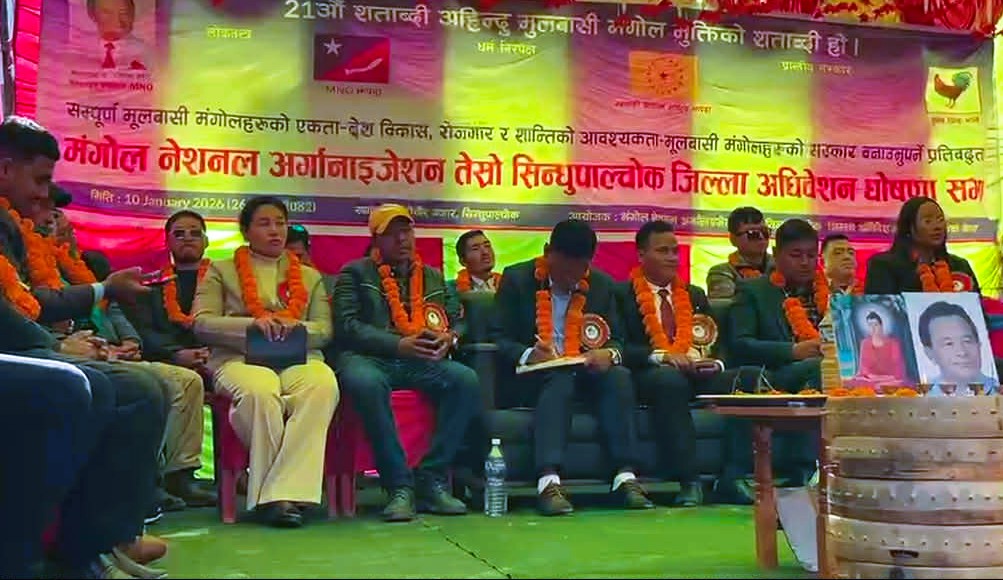 मंगोल नेशनल अर्गनाइजेसन एमएनओको तेस्रो सिन्धुपाल्चोक जिल्ला भेला शनिबार खाडिचौरमा सम्पन्न भएको छ। भेलामा संगठनका केन्द्रीय प्रवक्ता रिन्छेन तामाङ मुख्य अतिथि रहेका थिए। कार्यक्रमलाई सम्बोधन गर्दै प्रवक्ता तामाङले देशको अहिलेको जटिल राजनीतिक अवस्थाका बीच आउँदो फागुन २१ गते हुने प्रतिनिधिसभा निर्वाचन निर्णायक हुने उल्लेख गरे। उनका अनुसार देशलाई विकास र परिवर्तनको बाटोमा उभ्याउन सक्षम शक्ति एमएनओ नै रहेको दाबी गरीएका छन ।