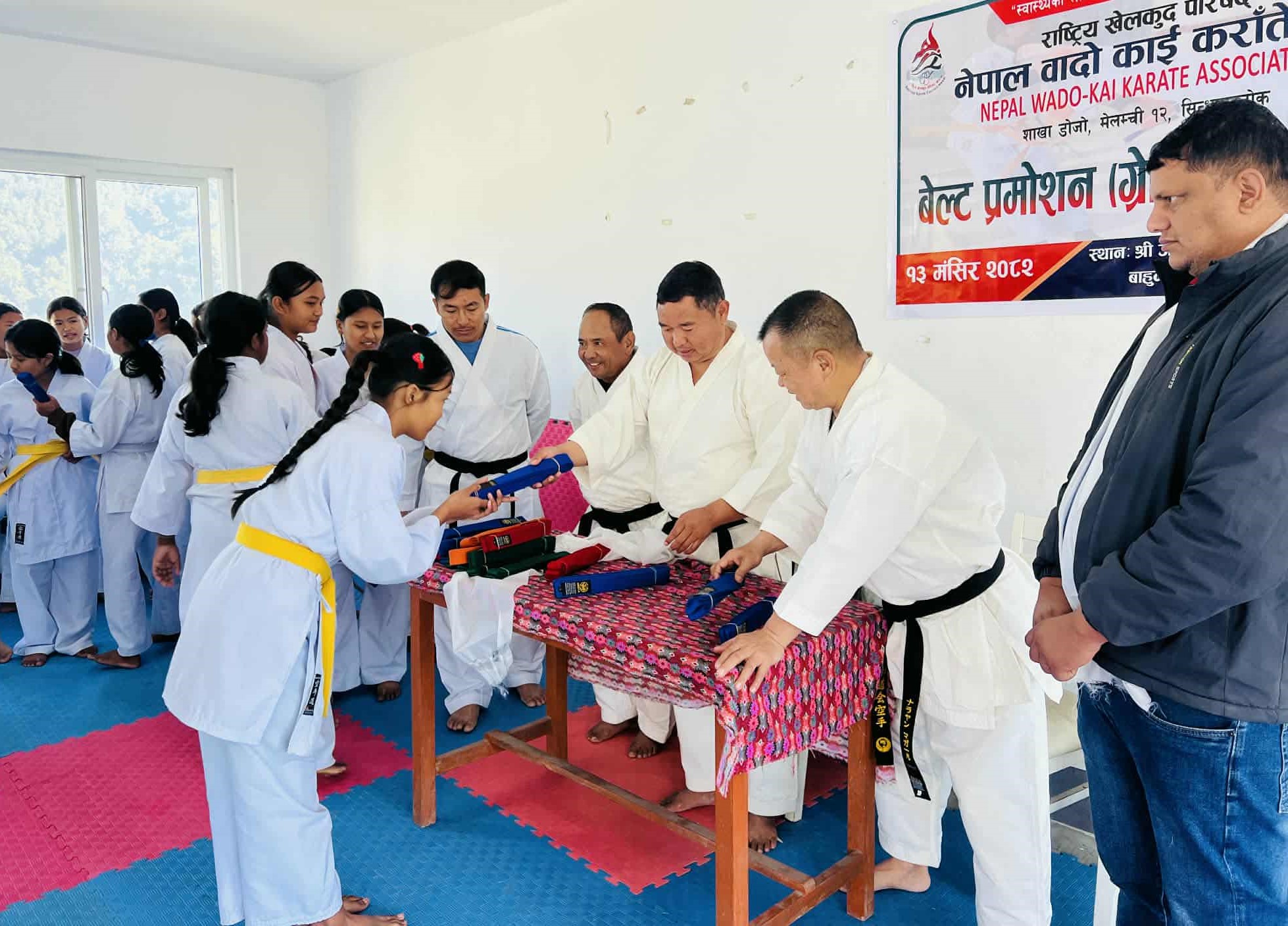 परीक्षणको आधारमा ३२ जना खेलाडीलाई ह्वाइटबाट एल्लो, एल्लोबाट ब्ल्यू तथा अरेन्ज गरी विभिन्न स्तरका बेल्ट बढुवा गरिएको प्रशिक्षक मिङ्मार तामाङले जानकारी दिनु भएको हो । कार्यक्रमका प्रमुख अतिथि तामाङले खेलकुदले युवा पुस्तामा आत्मविश्वास, शारीरिक फिटनेस र सकारात्मक सोच विकास गर्न महत्वपूर्ण भूमिका खेल्ने बताएका छन । कराँते जस्तो मार्शल आर्टले समाजमा अनुशासन, नेतृत्व र जिम्मेवारी बोध अभिवृद्धि गर्ने उनको भनाइ थियो।