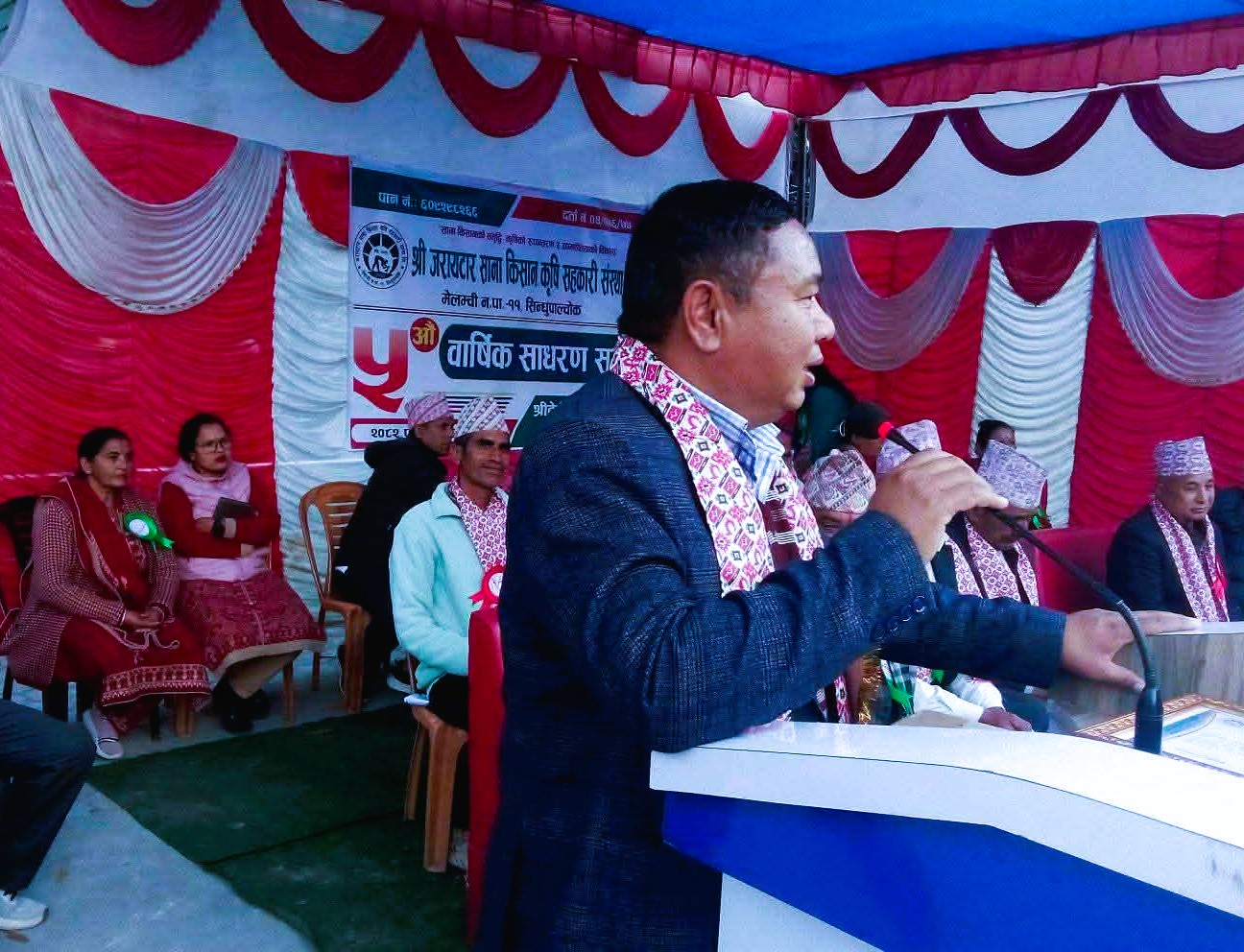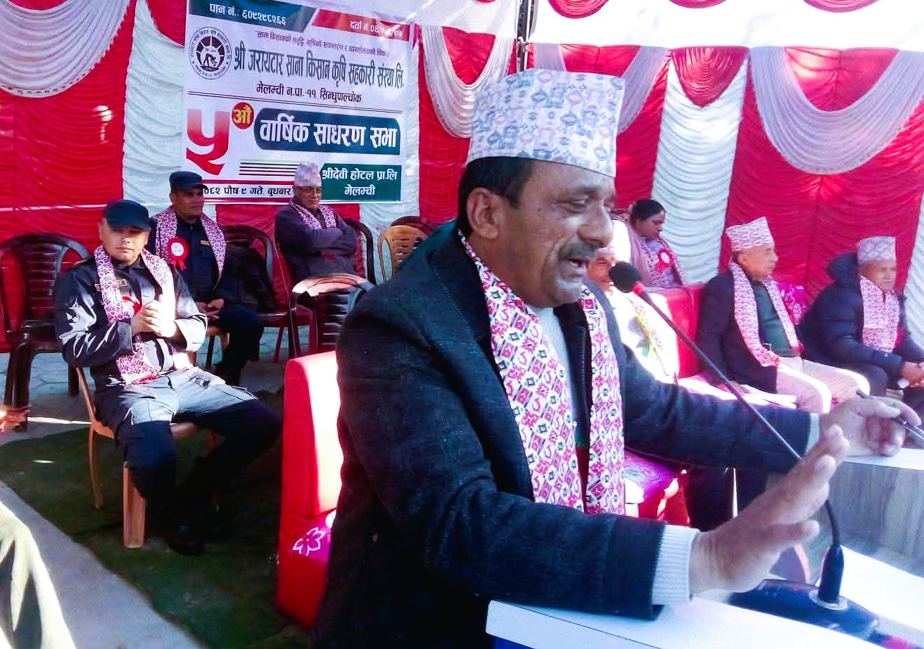 सिन्धुपाल्चोकको मेलम्ची नगरपालिका–११ जरायटारमा रहेको सानाकिसान कृषि सहकारी संस्था लिमिटेडको पाँचौँ वार्षिक साधारणसभा सफलतापूर्वक सम्पन्न भएको छ । सहकारीका अध्यक्ष शिवप्रसाद भट्टराईको अध्यक्षतामा आयोजित कार्यक्रममा मेलम्ची नगरपालिकाका प्रमुख आइतमान तामाङ प्रमुख अतिथिका रूपमा सहभागी हुनु भएको थियो । साधारणसभामा मेलम्ची–११ का वडा अध्यक्ष चन्द्रबहादुर तामाङ, प्रदेश कृषि सहकारी संघका सचिव तथा जिल्ला कृषि सहकारी संघका अध्यक्ष मित्रलाल चौलागाईं, सचिव रामशरण गिरिलगायतको सहभागिता रहेको थियो ।