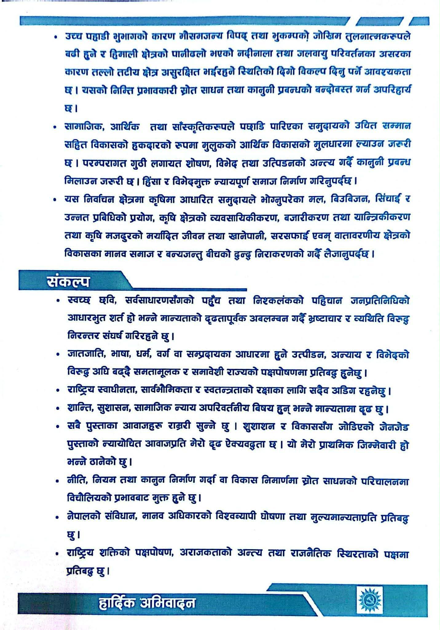 उम्मेदवार नेपालले सार्वजनिक गरेको प्रतिबद्धता पत्रलाई तीन भागमा प्रस्तुत गरिएको छ, जसमा क्षेत्रको समग्र विकास, स्थानीय सम्भावनाको उपयोग र पारदर्शी नेतृत्वलाई प्राथमिकतामा राखिएको छ। उनले राष्ट्रिय स्तरको मार्गदर्शनसँगै स्थानीय आवश्यकतालाई विशेष महत्व दिँदै योजना अघि सारेको बताएका छन्।
