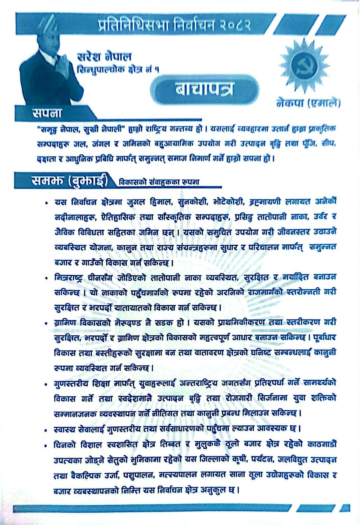 जनतापत्र, सिन्धुपाल्चोक — फागुन २१ गते हुने प्रतिनिधिसभा निर्वाचन नजिकिँदै जाँदा राजनीतिक गतिविधि तीव्र बनेका छन्। विभिन्न दलका उम्मेदवारहरूले आफ्नो निर्वाचन क्षेत्र केन्द्रित योजना र प्रतिबद्धता सार्वजनिक गर्न थालेका छन्। यसै क्रममा सरेश नेपालले सिन्धुपाल्चोक क्षेत्र नम्बर १ का मतदातालाई लक्षित गर्दै छुट्टै प्रतिबद्धता पत्र सार्वजनिक गरेका छन्। उनी नेपाल कम्युनिष्ट पार्टी (एमाले)का उम्मेदवार हुन्।