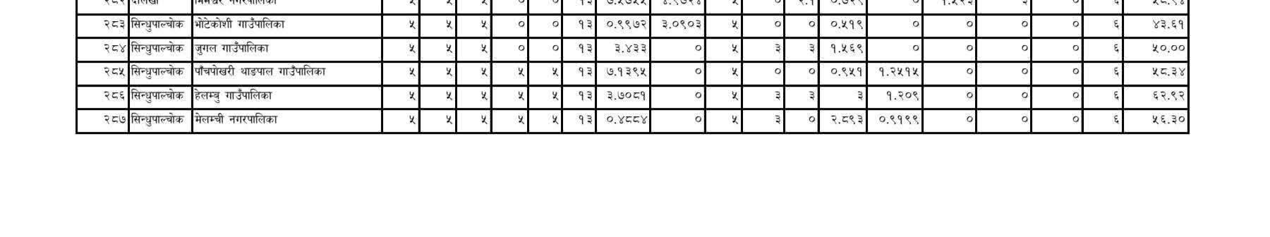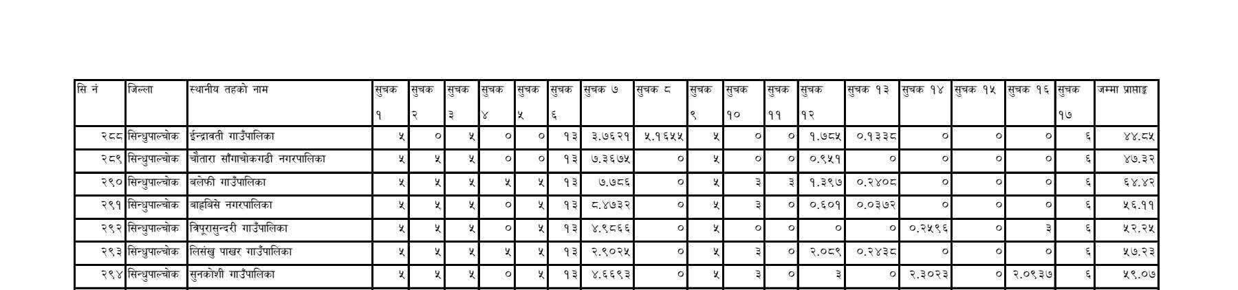 सिन्धुपाल्चोक जिल्लाका १२ वटै स्थानीय तहको हालै सार्वजनिक गरिएको कार्यसम्पादन मूल्याङ्कन प्रतिवेदनले विकास, सेवा प्रवाह र सुशासनको अवस्थाबारे स्पष्ट चित्र प्रस्तुत गरेको छ। मूल्याङ्कनको नतिजाअनुसार जिल्लामा बलेफी गाउँपालिका सबैभन्दा उच्च स्थानमा रहेको छ भने भोटेकोशी गाउँपालिका सबैभन्दा पछिल्लो स्थानमा देखिएको छ।